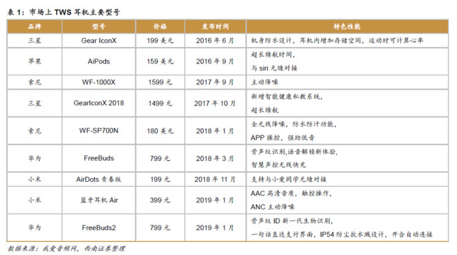 下图是目前市面上主流的TWS耳机列表,不同品牌的TWS 蓝牙耳机拥有不同的特色性能,如三星的GearIconX 2018 系列新增了智能健康私教系统,小米AirDots 青春版支持与小爱同学无缝对接等。