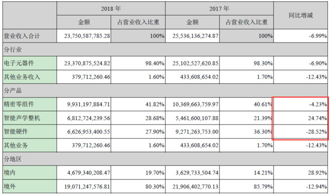 从歌尔18年报看,三大业务线只有智能声学(主要是无线耳机产品)在去年维持增长,一直被寄予厚望的VR类产品营收大降近四分之一。