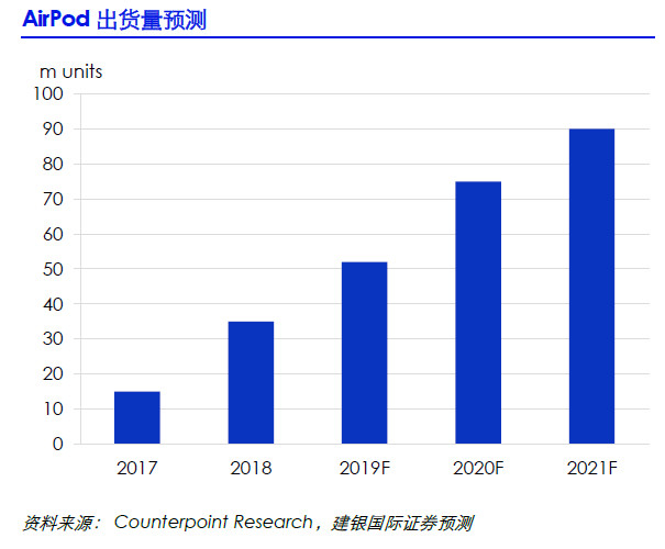 在目前的一众TWS耳机中,卖的最好的还是最早发布的AirPods,如今市占率近六成,18年出货量同比翻番,未来也还有很大的空间。