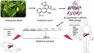 “要证实马兜铃酸导致肝癌,需要几个关键证据。”韩泽广告诉科技日报记者,一是动物实验表明马兜铃酸可以导致动物肝癌;二是肝癌患者马兜铃酸暴露证据,即患者组织中含有马兜铃酸代谢产物与DNA形成的加合物,这是最强有力的证据;三是遗传学证据,包括关键致癌基因突变,尤其“马兜铃酸指纹”所破坏。