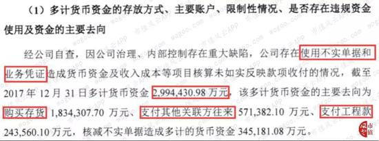 2019年4月29日,瑞华对康得新财务报表发表无法表示意见,指出对货币资金余额中的122.10亿元的银行存款余额无法取得充分适当的审计证据。
