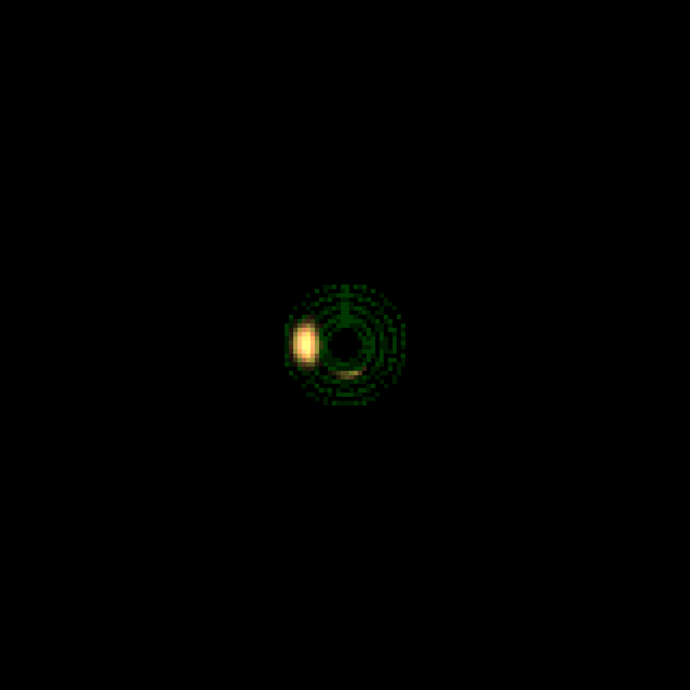 所以这张像甜甜圈的照片,黑洞其实在中间位置黑色的里面,围绕它的那一圈是黑洞外面的物质所发射出来的信号,被像哈哈镜一样的黑洞折射出来的射电信号。