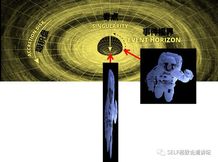 直到他掉到中间接近奇点的时候,如果头朝下掉就会被撕碎,如果横着掉就会被压扁。