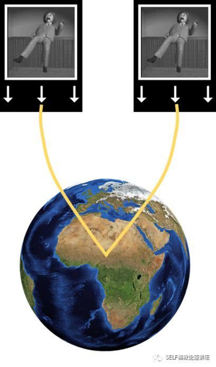 好比这张图显示的思维实验的情况,一开始这两个电梯是平行下落的,但到后来它们会撞到一起。因为引力的作用会引导它们向地心的方向走。