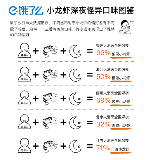 湖北人则把对榴莲的喜爱创新融入到小龙虾中。报告显示,湖北人消费了全国深夜50%的榴莲小龙虾;与湖北一样,四川人把对菠萝的热爱与小龙虾结合,菠萝小龙虾广受吃货欢迎,四川吃货消费了全国深夜69%的菠萝小龙虾,比例居全国第一;尽管东北人喜欢吃酸菜,但酸菜小龙虾却是福建人的喜爱口味。在深夜,全国每3只酸菜小龙虾中有2只是福建人吃掉的。