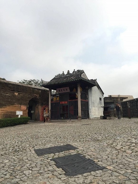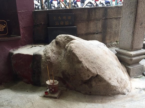 又,《澳门编年史》记载,1850年,“在大炮台下老饕巷兴建哪吒庙。该庙实际上是一座每边由三根石柱支撑的木式亭台,祭台上有一座供奉着哪吒的小神龛。据称,哪吒是澳门城区的保护神。”以此可见,柿山哪吒庙的兴建有一漫长过程。起初不过是一个亭台,甚至难以遮蔽风雨,后逐渐扩建成小屋,有了值事、司祝等职位,负责庙宇的管理。根据柿山哪吒古庙值理会向政府递交的申报非物质文化遗产的报告中说:最早在“其所立石上建庙供养,当时在古城墙水潭旁有麻石数块,遂于水潭上一块方圆数尺的麻石上构筑建庙,形如一座小屋,实为一座神龛,神龛内祀奉‘哪吒太子龙牌’, 而哪吒太子显圣所站立之麻石则以‘显灵石’纪念”。(图二)这符合上述《澳门编年史》摘引之外文记载。