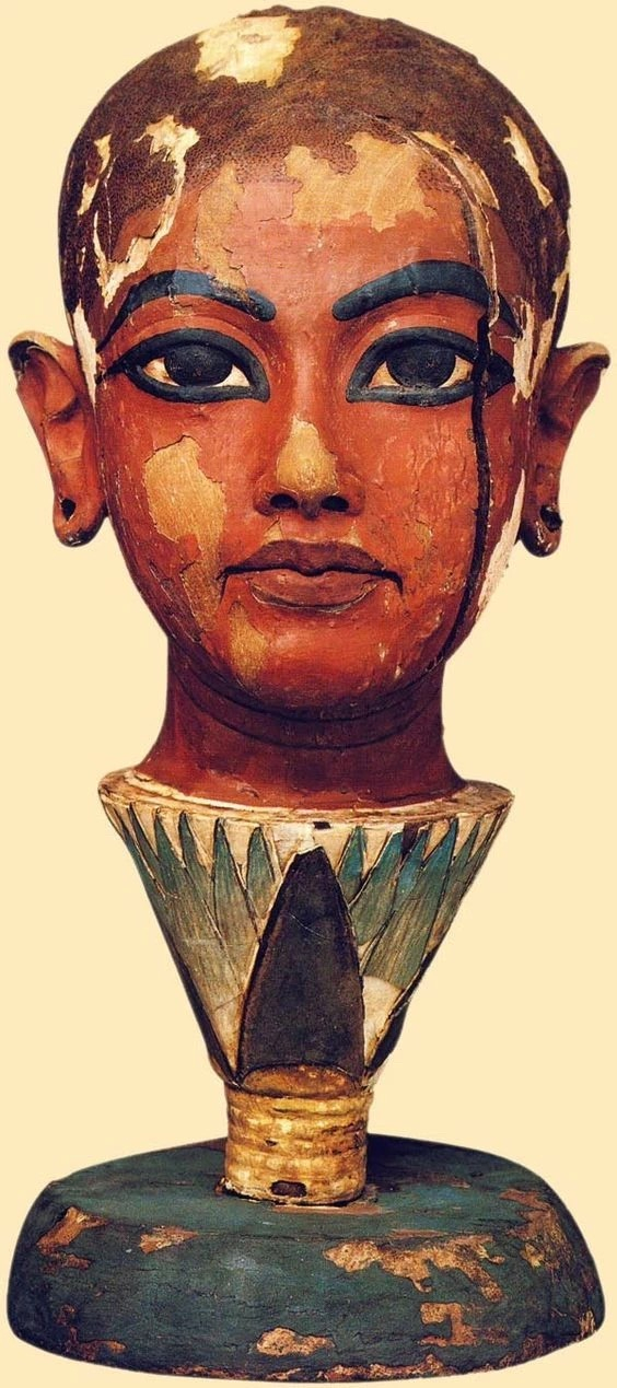 二十世纪初埃及图坦卡蒙墓的发现进一步证明了莲的重要性。蓝莲被发现散置于图坦卡蒙的尸体上,与墓中其他形式的莲花一起非常引人注目。其中之一是一尊作为孩童(或神祗)从莲花中出现的图坦卡蒙(约前1332—前1323)头像,这尊雕像是儿童时期的图坦卡蒙半身像(图十二)。在这里,我们发现了莲的三个重要的象征意义:王权、复活、儿童。笔者正是看到莲上的儿童图坦卡蒙才意识到哪吒莲花化身的惊人的相似。