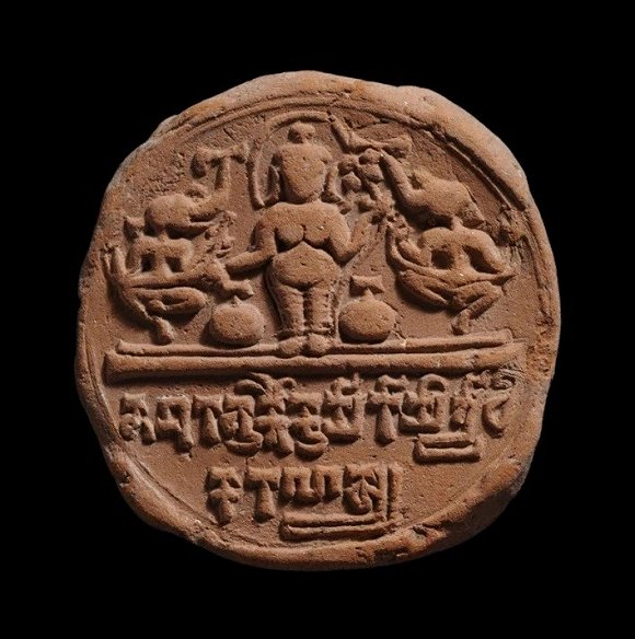 印度的封泥中莲花也见于菩萨诞生的图案(吉祥天灌顶,Laksmi-abhiseka)。在这种图案中,一个站立或端坐的女性(通常认为是吉祥天女,Lakshmi或Laksmi),被两头象按照灌顶仪式浇沃。灌顶(abhiseka rite)是一种洗礼、启蒙和仪式性的沐浴,经常在国王登基时举行,佛本生经常常记载。因此,灌顶本身就有王室和王权的象征。吉祥天灌顶的图案所刻画的女性身旁则有一或两头象,代表了释迦牟尼(Gautama Buddha)的诞生。这种表现常可辅以一个盛水器和莲花,或仅限于一株容器中的莲花。需要澄清的是,这类图案是否确切就代表菩萨诞生尚存争议,但印度代表生育和好运的古代符号——女性神祗、母神、象、莲花、容器、圣水——很有可能代表一种神圣的诞生仪式,如图十六吉祥天灌顶所示。