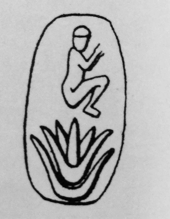 在伊拉克的尼姆鲁德(Nimrud)发现一枚极具趣味的椭圆印记(年代大约在公元前第七世纪末前)。印记是一名裸体儿童蹲踞在一朵莲花上,也可看做儿童从莲花上雀跃而出(图十五)。学者们注意到了这个形象的埃及来源,认为“最有可能来源于在叙利亚象牙制品中常见的荷鲁斯诞生的意象”。这个图案似乎与在尼尼微(Nineveh)发现的一块泥版文书上的莲上男童相同。但在尼尼微发现亚述人崇拜的版本,说明“婴儿荷鲁斯已被纳入刻印者的知识范畴,这无疑受到了叙利亚元素的影响”。而这些叙利亚元素,毫无疑问,其源泉来自埃及。前述莲上荷鲁斯四子以及莲上的幼童图坦卡蒙,就是两个原型,它们从形式到内涵都被各地的后来者模仿。因此,莲上男童描述了莲文化在宗教领域的影响,源自埃及,通过叙利亚,然后到达伊拉克。