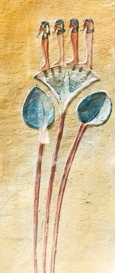 作为诞生与复活的象征,莲和奥赛里斯(Osiris,埃及关于往生、地下世界与死者的神)崇拜有着密切关联。荷鲁斯 (Horus)的四个儿子经常被描绘为站在奥赛里斯面前的一朵莲花上,如图十一“莲上的荷鲁斯四子”。古埃及的《亡灵书》中记载了“将自己转变为一朵莲花”,以实现复活的咒语。这个咒语的背后就是莲花可以使人复活的概念。这种复活的概念后来也传入印度和东亚,重生可以通过莲花达成(如哪吒)。这就是为什么莲花被用作死者佩戴的花卉项圈的一部分,因为人们相信闻嗅莲花可以帮助病人恢复健康,帮助死人复活。丹达腊(Denderah)古墓文献中写道:“太阳,源自初始,如鹰一般从莲蕾中升起。当莲叶之门在蓝宝石般的光芒中开启是,它就分开了日与夜。”关于荷鲁斯,我们也了解到他有从莲花中现身(诞生)的影子。“他睁开眼睛照亮世界。诸神自他眼中、人类由他口中,万物都通过他(出现),当他从莲花中光辉地升起的时候。”