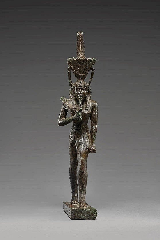 莲在古埃及人的生活中有自己的神——涅斐尔图姆(Nefertum)(特别与蓝莲有关)。他的名字被翻译作“完美性”、“美丽的生物”、“小泰姆(Tem)”,或“美丽的开端”,表明他是泰姆或阿图姆(Atum)的首次化身。涅斐尔图姆一般被展示为一朵盛开的莲花形成的王冠,或带着莲冠的青少年(图十)。涅斐尔图姆展示的莲与青少年 (儿童)的结合,如前所述,在亚洲相当流行,儿童可以是王子、毗湿奴、释迦牟尼或者哪吒。与哪吒信仰更为重要的是,古埃及人相信莲花可以治病,而放置于金字塔内木乃伊旁边的莲可以帮助死去的法老(木乃伊)复活。也就是说,莲有起死回生(复活)的功能,因此,莲也是埃及的“治愈之神”。
