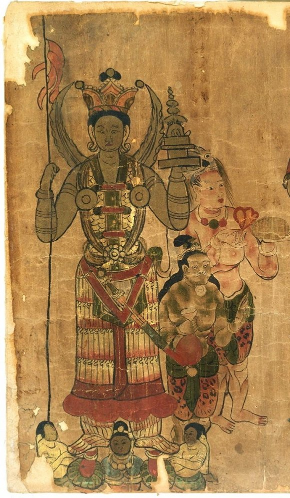 既然哪吒是佛经中记载,他当然就是佛教神灵,是天王之子,属于护法神。佛教的护法神,从印度传来时往往面目狰狞,现忿怒相,以镇妖魔,哪吒起初也是如此 (图五)。不过,由于他是太子,后来就开始以童子身份出现。在敦煌毗沙门天王赴哪吒会图中,哪吒均作童子形象。如图六敦煌毗沙门天王像所示,天王左侧白净粉红持宝花之童子,笔者以为即是儿童化了的哪吒。一般均以为天王旁边为二夜叉。不过,仔细观察此图,我们发现,此二人一人为儿童粉色白净,相对高大,面容呈现明显的华夏特征,几乎和后来哪吒“粉嘟嘟”的形象一致;而另一人成年,矮黑,面貌奇特,则两者之对比可知非为一类。据此可判断前者便是华化后的哪吒三太子,明清小说中哪吒童子的形象即可追溯至此。