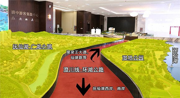 抚海湾湿地公园则位于抚仙湖水岸线以北、澄川线-环湖公路以南,首期占地约3000亩,规划有东西两大入口,包括广龙国际艺术中心、风情水街体验区、滨湖湿地科普区、多功能运动会馆四大主题区域。