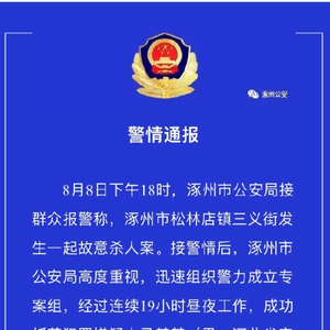 据河北涿州市公安局官方微博通报,8月8日下午18时,涿州市公安局接群众报警称,涿州市松林店镇三义街发生一起故意杀人案。接警情后,涿州市公安局高度重视,迅速组织警力成立专案组,经过连续19小时昼夜工作,成功抓获犯罪嫌疑人马某某(男,河北省安国市人)、李某(男,河北涿州市人),经初步审讯,两名犯罪嫌疑人对犯罪事实供认不讳。目前,此案正在进步审理中。
