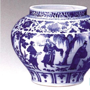 元代瓷绘三顾茅庐图以景德镇窑青花制品为代表,颇具盛名的有两件:一件为元青花三顾茅庐图大罐;另一件是元青花三顾茅庐图带盖梅瓶。