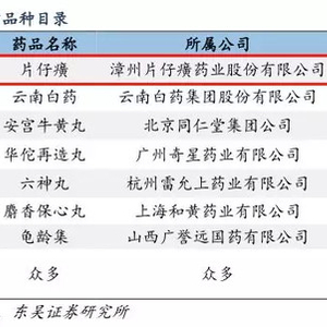 片仔癀,主打产品为片仔癀、片仔癀胶囊等系列产品,还有一些普通药品,如藿香正气水等。此外,基于中药材的保健属性,业务范围还衍生到保健食品、日用品、化妆品、功能饮料等业务。