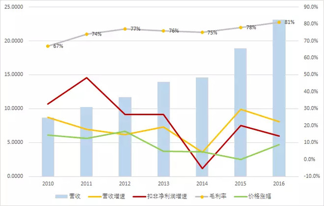 下游需求稳步增长,上游原材料稀缺,配方独家绝密,几大要素,让提价直接刺激收入快速增长,2005年至2016年,营收的平均同比增速为21%。
