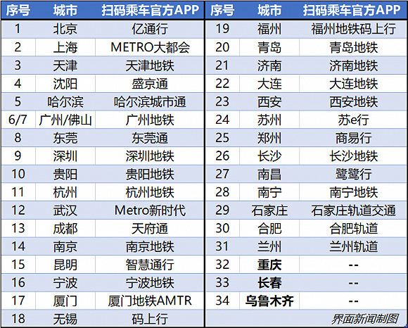 目前中国内地有34座城市开通了地铁,据界面新闻统计,其中31城地铁公司推出了可扫码乘地铁的APP,重庆、长春、乌鲁木齐三城还无法使用手机扫码乘地铁。