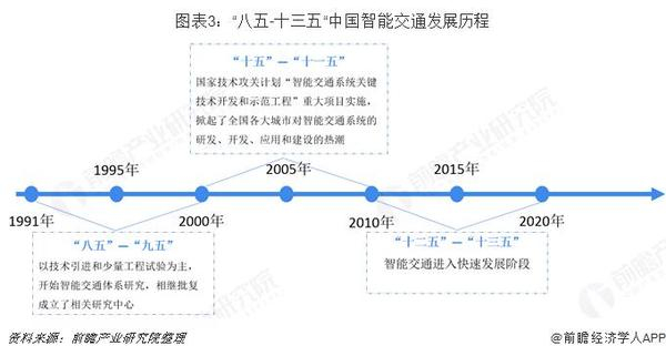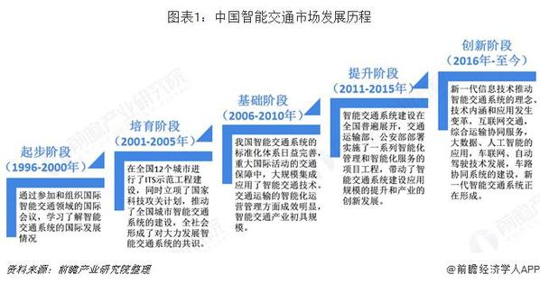 纵观我国智能交通市场发展历程,可以将其分为五个阶段:在起步和培育阶段,我国智能交通行业停留在学习和制定研究方案,形成大力发展智能交通系统的共识;在基础阶段,随着北京奥运、上海世博会等重大国际活动的召开,我国开始将智能交通技术进行实际应用,为活动举行提供交通保障,行业初具规模;在近几年,信息技术推动了整个智能交通的理念,技术应用发生创新性变革。