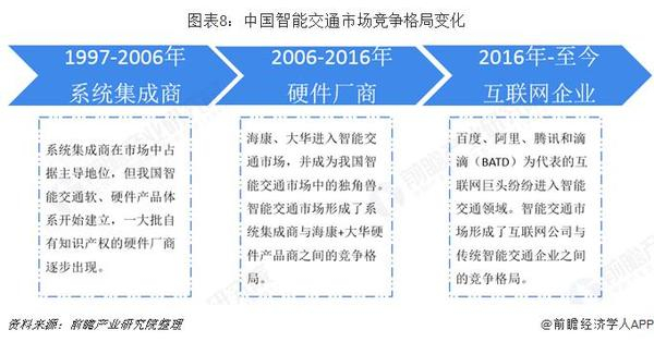 而聚焦我国智能交通市场竞争格局,其与我国智能交通市场发展历程变化相对应。在起步和培育阶段,我国智能交通行业的主体为系统集成商,背靠政府支持发展;到了基础和提升阶段,以海康、大华为首的硬件厂商入局,与系统集成商并进;而近年来,随着信息化技术的发展,互联网+企业在传统智能交通领域的崛起,引发了与系统集成商,以及与以交通信号机硬件产品为核心业务的硬件厂商的竞争。