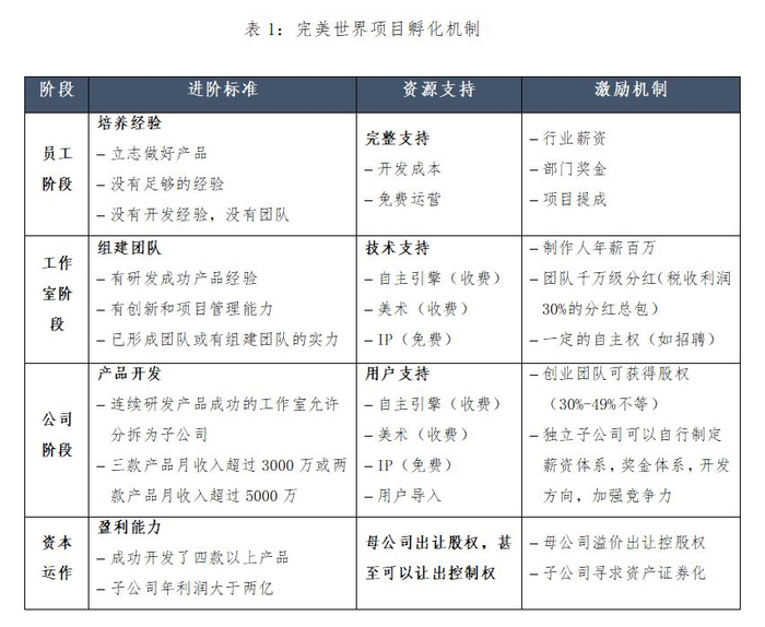 以工作室阶段为例,完美世界为同时具有以下三种特质的员工创建独立工作室:(一)有研发成功产品的经验;(二)有创新和项目管理能力;(三)已经有团队或者有组建团队的实力。工作室成立之后,成为完美世界的一个小的利润单元,财务上独立核算。在资源支持方面,完美世界提供免费的IP资源,但公司的自主引擎和美术服务需要收费。在激励机制方面,工作室带头人可享有百万年薪,团队可享受税后利润的30%作为分红,另外团队在管理上具有一定的自主权,比如可按照工作室需求独立招聘等。