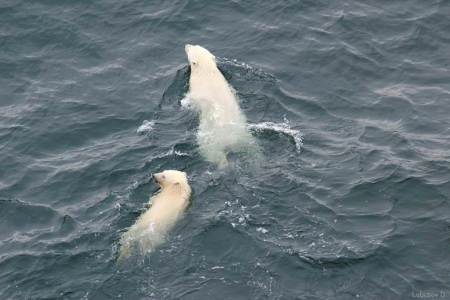 楚科奇海航行。15时,在左舷不远处,看到两只北极熊在水里游戈,一大一小,像母子在嬉戏,又像熊妈妈在传授熊宝宝征服大自然的本领。大家激动不已。北极熊,是北极之灵兽,既威武、又天真可爱。途中还时有鲸鱼出没。
