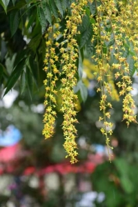 立秋时节,行人稀稀的芳邻路上,街道两侧的栾树充满绿意的枝叶顶部已经开满了密密的金黄色小花。栾树总会在闷热而多雨的酷暑时节开花,金黄色小小的花朵细细碎碎,在枝头大簇大簇地挤在一起,在浓密的绿叶间形成一个个金色花序,它们此起彼伏般开放,从七月中旬一直延续到九月。直到中秋时节的一场秋雨过后,树下便是一地的细碎金黄。