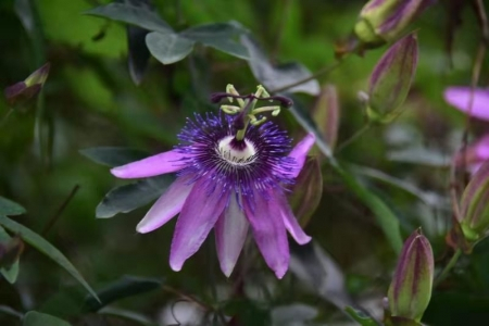 西番莲属的花都长得极为惊艳,它们有着奇特怪异的多层花冠和雌雄蕊柄。最上面三裂的柱头就像三根钉子,而下面的花药就像五道伤痕,而英文passion除了热情还有受难的意思,所以西番莲的花还有个名字便是“受难花”。所有的西番莲属植物的花都带着这样的相似特征,那些直立的雌雄蕊柱和丝状物总让人感觉极为怪异的,奇特的多层花冠更是让人印象深刻。
