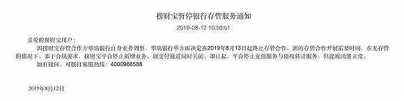 除了证大财富微金服之外,证大旗下另一家网贷平台——捞财宝平台今日也同样陷入被银行终止存管的困境。捞财宝官方网站的公告显示,“因捞财宝存管合作方华瑞银行自身业务调整,华瑞银行单方面决定在8月13日起终止存管合作。即日起,捞财宝停止新增业务,平台停止充值服务与债权转让服务,提现功能正常。”