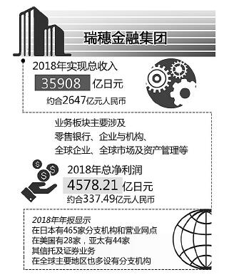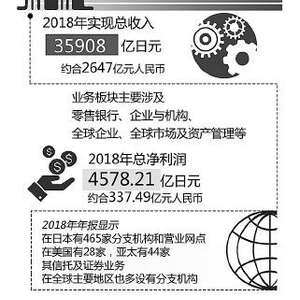 2.经营情况。在日本政府的支持下,2000年第一劝业银行、富士银行和日本兴业银行三家通过换股方式成立了瑞穗金融集团,从传统银行转型为综合金融服务集团,并将业务扩充至全球范围,并于2006年在纽交所上市。2008年金融危机后,欧美国家普遍收缩市场,日本金融集团则抓住机遇进一步拓展海外市场。2018年瑞穗金融集团实现总收入35908亿日元(约合2647亿元人民币),较上年上升7.13%。其业务板块主要涉及零售银行、企业与机构、全球企业、全球市场及资产管理等,在2018年总净利润为4578.21亿日元(约合337.49亿元人民币)。