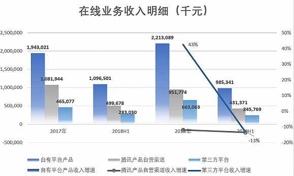 阅文集团的日子并不好过。仔细分析这家公司收入趋势会发现:2019年上半年在线业务收入由2018年同期的18.39亿元,下降到了16.62亿元,同比下降11.5%。其中自有平台业务和腾讯产品自营渠道均出现了收入的同比下滑。这在过去是从未发生过的事情。
