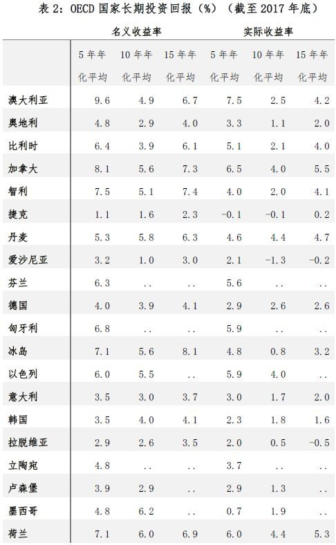 OECD数据显示,20个国家的26只公共养老基金在2011-2015年期间均取得了正实际收益,跑赢通货膨胀。资产配置差异基本解释了各国公共养老基金收益差异。新西兰超级年金、瑞典AP1-AP4、加拿大储备基金和澳大利亚未来基金等权益类和另类资产配置比例较高的公共养老基金均拥有强劲的五年年度实际回报率。[14]