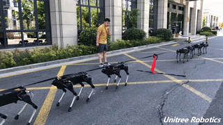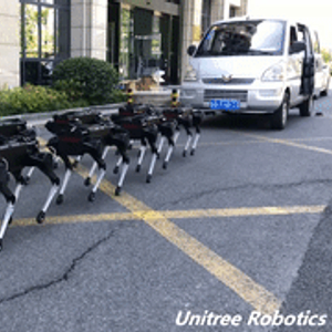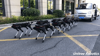 近日,作为“挑战者”,中国机器人初创公司宇树科技也发布了四足机器人“莱卡狗”(Laikago)的新视频。从视频中可以看到,8台Laikago Pro合力拖动了一辆坐有人的面包车。