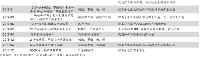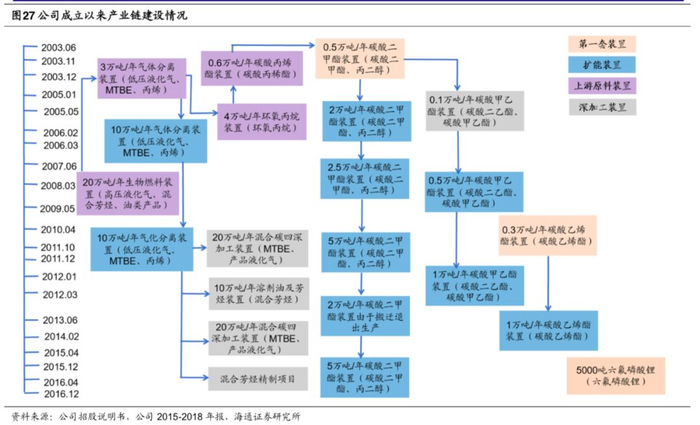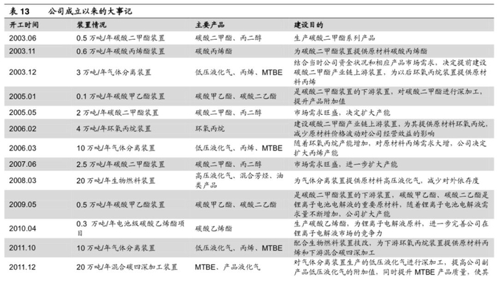 公司是国内第一批DMC 生产企业,在2003年6月建设了5000 吨/年碳酸二甲酯(DMC)产能,随后不断进行扩张产品产能和上游原料产能。到 2015 年,公司完成了5 种锂离子电池电解液溶剂产品的产业链建设,是国内能够同时为锂离子电池电解液生产厂商提供 5 种溶剂的企业。