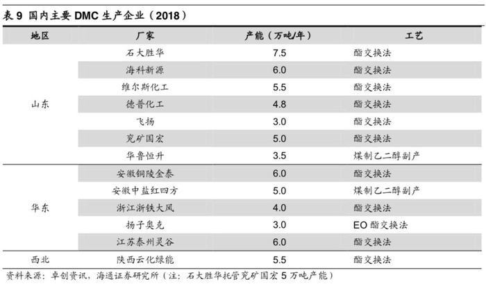 国内DMC产量约40万吨,工艺多样化。根据卓创数据,2018年我国主要的DMC生产企业共13家,合计产能约65万吨。根据石大胜华2018年报,2018年碳酸二甲酯行业全年销售量近40万吨,各厂家开工负荷较往年均有所提高,主要应用市场由原涂料、胶黏剂等行业向聚碳酸酯、电解液溶剂等新兴市场转移。同时,2018年国内碳酸二甲酯产能较往年增加明显,生产工艺多样性更加丰富,由于煤制乙二醇副产DMC,所以以华鲁恒升为代表的煤制乙二醇生产企业也成为了DMC的供给方。