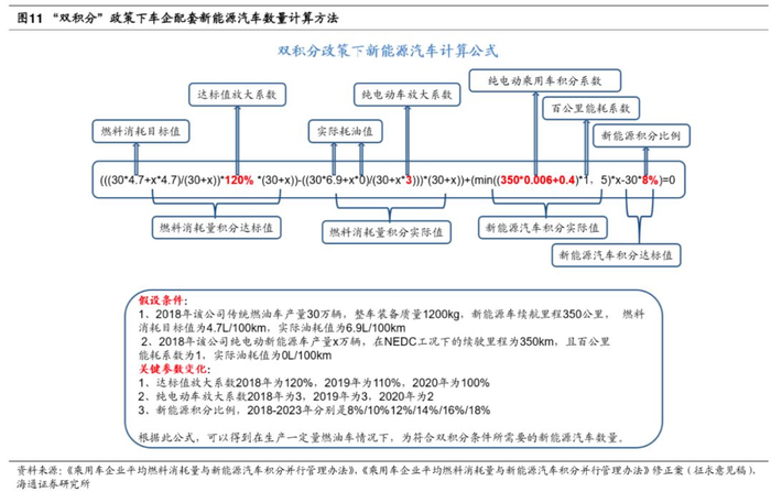双积分政策下,2019-2020年新能源汽车产销量增长是确定性事件。根据以上的分析,在了解了双积分政策的计算方式后,我们可以得到一家车企为了满足双积分的要求必须配套的新能源汽车的数量,下图中我们给出了计算公式,并且对各个指标进行了解释说明,重要参数的变化,会使得等式中求得的新能源汽车数量x的变化,未来几年,重要参数包括:1)根据《乘用车燃料消耗量评价方法及指标(GB 27999-2014)》的规定,达标值的放大比例,2018年是120%,2019年是110%,2020年是100%;2)根据《乘用车燃料消耗量评价方法及指标(GB 27999-2014)》以及《乘用车企业平均燃料消耗量与新能源汽车积分并行管理办法》修正案(征求意见稿)的规定,新能源积分比例,2018-2023年分别是8%/10%12%/14%/16%/18%;3)按照《乘用车燃料消耗量评价方法及指标(GB 27999-2014)》的规定,纯电动车放大系数2018-2019年为3,2020年为2。