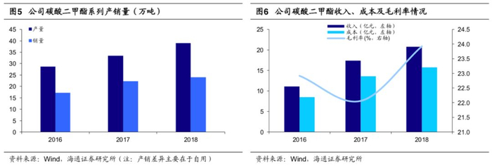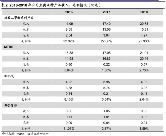 碳酸二甲酯系列产品盈利稳定,毛利占比高。公司主要产品包括DMC系列、MTBE、液化气等,其中DMC系列产品毛利率最高,2018年DMC系列产品收入占比40%左右,毛利占比达到80%左右,2016-2018年产品毛利率稳定在22-24%左右。