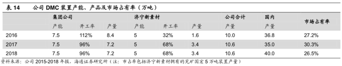 租赁资产,保持较高市场占有率。根据石大胜华2016年报,公司子公司济宁新素材公司租赁兖矿国宏5万吨碳酸二甲酯装置,有效期为2016.01.01-2020.12.31,其中2016-2017年该装置产生的净利润归公司所有,2018-2020年该装置产生的净利润60%归公司所有,40%归兖矿国宏所有。2016年,该装置开工率仅32%,远低于公司7.5万吨装置的开工率(112%),产量仅为1.6万吨。2017年,该装置开工率上升至68%,产量达到3.37万吨,2018年,该装置产量与2017年基本持平。在第二套装置提荷增质、国内供给略微收缩的情况下,公司保持较高的市占率,2018年DMC(不区分工业级和电池级)市场占有率约26.5%。