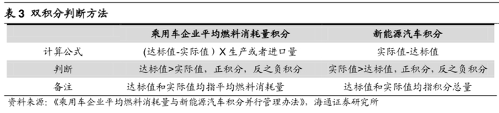 新能源积分占比指的是新能源积分/传统车数量的值。国家要求新能源积分占比提高,企业一方面可以通过增加符合积分政策的新能源汽车的生产获得积分,另一方面可以通过减少传统车的数量以增加新能源积分占比。“双积分”指的是平均燃油消耗量积分(CAFC积分)和新能源积分(NEV积分),具体判断方法如下所示。