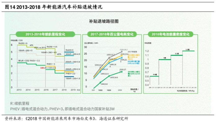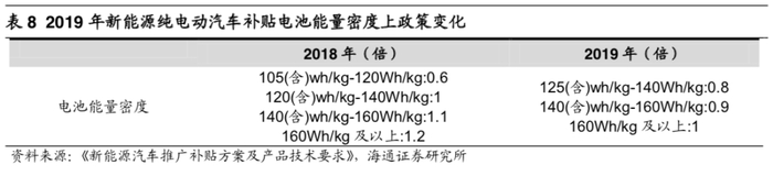 补贴退坡,倒逼成本下降。根据政府最新出台的《关于进一步完善新能源汽车推广应用财政补贴政策的通知》,新能源汽车补贴退坡力度进一步加大。对于纯电动乘用车动力电池能量密度的补贴相较于2018年也有了很大调整,补贴门槛提升到125Wh/kg,而且即使电池能量密度达到160Wh/kg及以上,补贴系数也只有1倍。我们认为,由于电池在新能源汽车的成本中占据30-40%,补贴标准的下降迫使车企要寻求电池成本的下降。