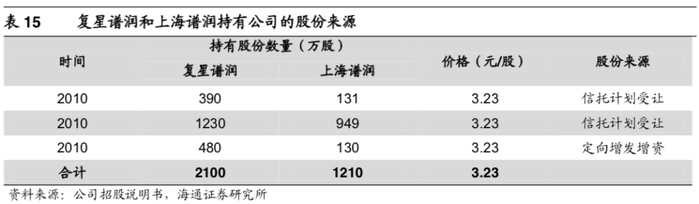 根据公司2015-2018年年报披露,复星谱润和上海谱润原分别为公司二、三股东。其持有的公司股权,主要来自于公司初始股东英大信托的受让以及后期增发,初始成本为3.23元/股。2002年公司设立时和2005年公司增资时,英大信托先后两次认购了石大胜华的股份,英大信托认购股份的资金来源分别为信托计划一期和信托计划二期筹集的信托资金,这两期信托的主要委托人和受益人为中国石油大学(华东)及其下属企业教职工。2010年1月26日,上述两期信托分别召开受益人大会,决定自2010年1月26日起终止上述两期信托计划。信托计划一期计划转移中,复星谱润和上海谱润分别受让390/131万股,受让价3.23元/股,信托计划二期计划转移中,复星谱润和上海谱润分别受让1230/949万股,受让价3.23元/股。信托财产受让后,复星谱润持有公司1620万股,占比16.12%;上海谱润持有公司1080万股,占比10.75%。2010年公司定向增发增资至1.52亿元,复星谱润和上海谱润分别认购480/130万股,认购价格均为3.23元/股,完成后复星谱润持有公司2100万股,占比13.81%;上海谱润持有公司1210万股,占比7.96%,综合成本均为3.23元/股。