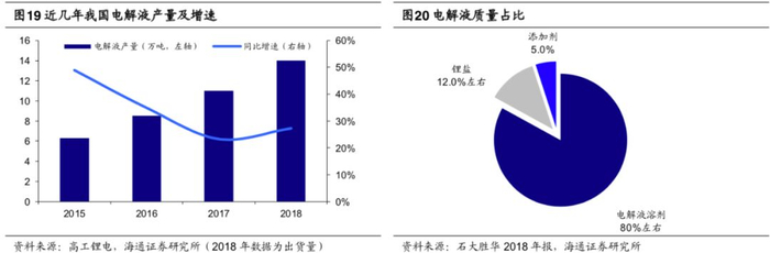 电解液产量稳定增长。根据高工锂电数据,2018年我国电解液出货量14万吨,同比增长27.3%。锂离子电池电解液一般由锂盐(溶质)、溶剂、添加剂混合而成,其中锂盐比例一般在12%左右,溶剂80%左右,添加剂5%左右,具体比例将视下游客户的需求而定,以溶剂质量占比80%计算,2018年我国电池电解液溶剂的需求量在11万吨左右。