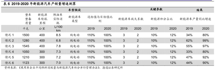 根据我们测算,2019-2020年新能源汽车产销增速在40-80%。根据上一段分析,车企需要生产更多的新能源汽车才能满足双积分要求,但由于不同车企生产的车辆不同,其需要增加的新能源汽车数量也不同。我们分析以下几种情况,表中的假设均为常见车型和合理假设,我们认为2019-2020年新能源汽车产销增速在40-80%。