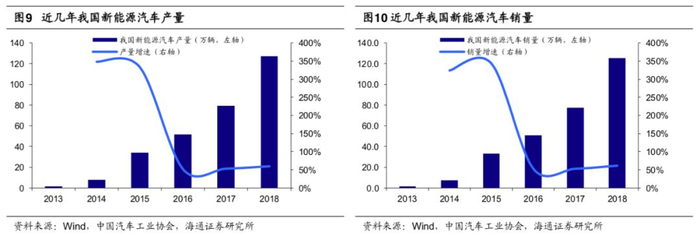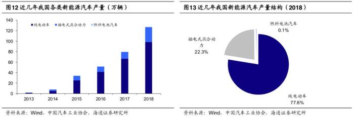 新能源车结构性变化,纯电动车占比有望提高。根据我国汽车工业协会数据,2018年我国新能源车总产量127.1万辆,其中纯电动车98.6万辆,插电式混合动力车28.3万辆,燃料电池汽车0.15万辆,纯电动车占比达到77.5%,较2017年的83.9%有所下降,但长期来看,我们认为纯电动车在非燃料电池新能源汽车(即纯电动车+插电式混合动力车)的占比有望持续提高。