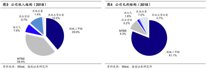 碳酸二甲酯贡献大部分毛利。2018年,公司主要产品类型包括碳酸二甲酯系列、MTBE、液化气、混合芳烃等,其中除了碳酸二甲酯以外,其余的产品毛利率较低,因此,碳酸二甲酯产品收入占比仅为39.0%,但毛利占比达到81.1%,因此碳酸二甲酯系列产品的盈利最直接影响到公司整体的盈利水平。
