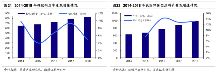 油漆、涂料、粘胶剂行业约占国内DMC 消费总量 50%以上。DMC 由于具有溶解性能优良,熔、沸点范围窄,表面张力大,粘度低,介电常数小,蒸发温度高,蒸发速度快等特点,因此可以替代有毒性的甲苯、二甲苯产品等。近5年来,我国粘胶剂和环保型涂料市场稳定增长,随着消费者环保意识和环保要求的不断提高,DMC 无毒性、高安全性的特点迎合了市场的需要。