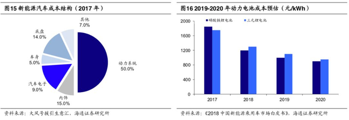 新能源整车成本主要在动力系统,这也是降成本的主要来源。根据大风号援引的生意汇文章《新能源动力电池成本,分类、优势及突破》,动力系统占到总车成本的50%,而电池占到动力系统成本的76%,则综合来看电池占总车成本的比例为50%*76%=38%,电池成本在新能源汽车整车总成本中占据相当大的比例。同时,《2018中国新能源乘用车市场白皮书》预计,未来新能源汽车成本下降主要来自于电池,磷酸铁锂电池2019-2020年分别下降16.7%和10.0%,三元锂电池2019-2020年分别下降15.4%和13.6%。