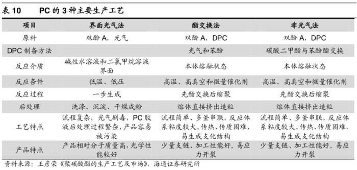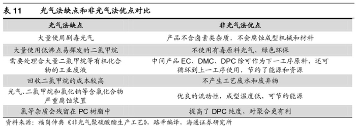 PC非光气法更加环保。根据《非光气聚碳酸酯生产工艺》,非光气法生产PC的过程中,不需要使用剧毒光气和易挥发的二氯甲烷,相比于光气法更加安全、绿色、环保。同时,该工艺的中间产品可以循环利用,节约能源和资源,生产中不产生工艺废水,且产品DMC纯度更高。我们认为,在安全环保生产趋严的背景下,未来会有更大的非光气法PC产能落地。