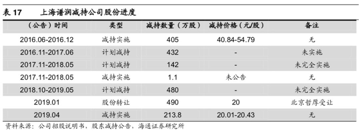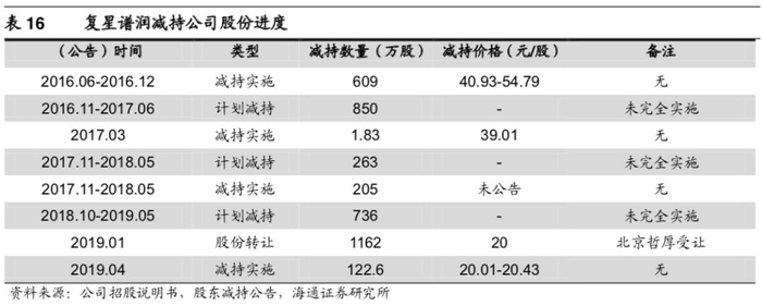 公司上市后,复星谱润和上海谱润开始减持,2019年1月后完全退出。公司2015年完成上市,上市后复星谱润持有公司2100万股,占比10.36%;上海谱润持有公司1210万股,占比5.97%。2016年6月,复星谱润和上海谱润均开始减持,在2016年6-11月中,复星谱润累计减持股份609万股,减持价格在40.93-54.79元/股之间;上海谱润累计减持股份405万股,减持价格在40.84-54.79元/股之间。减持后复星谱润持有公司1491万股,占比7.35%;上海谱润持有公司805万股,占比3.97%。同时,复星谱润和上海谱润分别计划在2016年12月-2017年6月减持不超过850/432万股,但复星谱润仅在2017年3月减持1.83万股,减持价格39.01元/股,而上海谱润未实施减持。2017年10月,公司公告复星谱润和上海谱润减持计划,分别计划减持263.06/142.3万股,2018年5月,公司公告在减持期间,复星谱润实际减持204.56万股, 上海谱润实际减持1.1万股。2018年10月,公司公告复星谱润和上海谱润减持计划,分别计划减持735.79/480.29万股。2019年1月,复星谱润和上海谱润分别将其持有的1162/490万股(占比5.73%/2.42%)公司股份转让给北京哲厚,转让价格为20元/股,转让后复星谱润不再持有公司股份,上海谱润持有300万股(1.48%)。2019年4月30日,公司公告复星谱润和上海谱润从2018年12月到2019年4月共分别减持了122.6/213.8万股(0.61%/1.06%)。