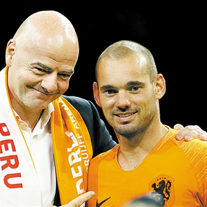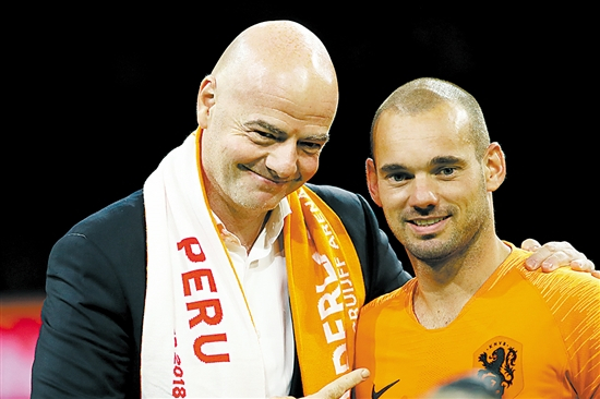 国际足联主席因凡蒂诺(左)出现在斯内德的告别赛上 图/视觉中国